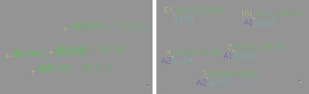 Слева: файл формата DXF, экспортированный из более ранних версий Flexfield (до версии 5.00), показан в программном обеспечении САПР Справа: точки, экспортированные из FlexField 6.0: разные слои разных цветов (желтый: идентификатор точки, зеленый: координаты X / Y, светло-синий: координата Z, темно-синий: код)