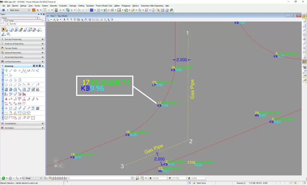 В конструкторском бюро становится очевидным большое преимущество сохранения файлов в формате DXF непосредственно на приборе. Этапы преобразования устарели. Тот же файл формата DXF, который был сохранен на приборе FlexLine, можно открыть с помощью любого программного обеспечения САПР. Оператор САПР найдет кромку бордюрного камня в виде точек, обозначенных кодом “KB”. Он может непосредственно начать с проектирования газопровода с заданным смещением в 2 метра от края бордюрного камня. Я рекомендую использовать отдельный слой для газопровода.